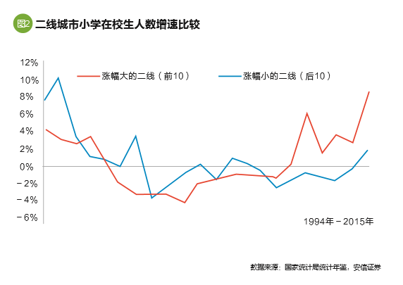 这意味着,2010年以前,从小学在校生人数增速的角度观察,房价涨幅靠前的二线城市和靠后的二线城市人口流入的趋势没有明显的区别。人口开始流入一部分二线城市,而离开另一部分城市,这种情况是2011年到2012年才开始出现的。