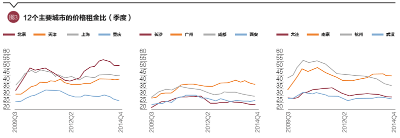 最后,从房价-租金比来看,中国这一指标同其他较成熟的市场(如美国等)相比明显过高,但多数城市并未出现上升的趋势。图3中2014年第四季度的数据显示,房价-租金比城市间的波动幅度较大,低至20,高至50以上,但都高于美国2011年7月的人口普查所报告的数据。在该报告中,美国第三大城市芝加哥的房价-租金比也仅在15-45之间。在受调查的30个城市中有16个城市的房价租金比在20以下;还有8个城市介于20和30之间,达到30的城市有5个:纽约、洛杉矶、圣何塞、西雅图和华盛顿;唯一在40以上的是洛杉矶,达到了44.1。从图3可以看出,自2009年以来,广州的房价租金比已从原先的30上升至40。其他城市,如上海、天津、重庆、武汉和大连的房价-租金比均呈下降趋势,杭州、成都和西安也都有大幅下降;北京和上海平均的房价租金比率最高,自2013年第一季度以来,便已在50以上。值得引起高度重视的是,高房价租金比的市场隐藏着很大的潜在风险。研究表明,以北京为例,假设北京市场对房价升值的预期只需下降1个百分点,市场的均衡价格则会下滑34.5%。由此可见,即使像北京这样市场基本面强劲的城市,依然不能低估房地产市场中潜在的风险。