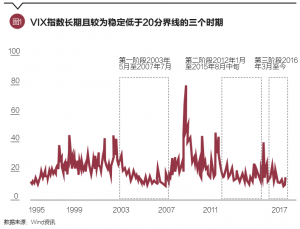 2000年以来,VIX指数长期且稳定低于20分界线的时期大致有三段:第一段是2003年5月至2007年7月,第二段是2012年1月至2015年8月中旬,第三段是2016年3月至今,如图1所示。各阶段大类资产表现分化明显,并未呈现稳定的可遵循的模式。