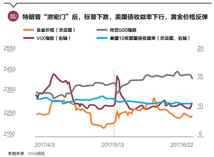 为考察VIX指数突变时大类资产的走势,我们选取了2007年美国次贷危机爆发,2016年初美国经济表现疲软美股大跌,以及近期发生的特朗普“泄密门”三个代表性的风险事件作为考察的时间点。结果显示,虽然三个事件对市场的冲击程度依次递减,但在这些风险事件发生时,VIX指数都出现了明显拐点,且美股、黄金和美国国债对VIX指数拐点的敏感度要明显高于商品。