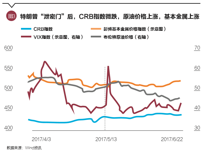 近期美国总统特朗普被爆出“泄密门”事件后,引发外界对其可能遭受弹劾的猜想,市场担忧增加导致VIX指数在5月17日出现飙升。“泄密门”被曝光当日,市场短期避险情绪升温,VIX指数由10左右的水平,迅速上涨至15以上,标普500指数下跌,10年期美国国债收益率下跌,黄金价格当日上涨近2%,如图2所示。但商品对于“泄密门”事件引起的VIX指数拐点,反应并不敏感,CRB指数微跌,原油和基本金属价格上涨,如图3所示。