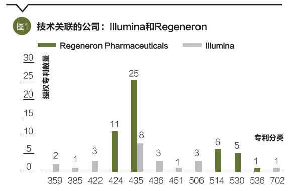 技术关联的特殊性在于,两家公司可能在其他方面迥然不同,而在技术领域关联密切。例如,Illumina是一家基因测序仪生产商,涉及的技术领域包括光学(Class 359, 385)、化学仪器(Class 442)和数据处理(Class 702);再生元(Regeneron)则是一家生物制药公司,涉及的技术领域则包括药物(Class 424, 514)、多肽(Class 530)和有机化合物(Class 536)。两家公司一家生产仪器设备、一家生产药物,它们既不在同一个行业,也并非上下游,但却在同一个技术领域——分子微生物学(Class 435)中具有大量的研发。在2002年至2006年,Illumina共授权22件专利,其中8件属于分子微生物学领域,而再生元共授权48件专利,其中25件属于同一领域,如图1所示。根据技术相似度的计算方法,两家公司在2006年底的技术相似度高达0.71。事实上,许多公司在产品市场领域和技术领域存在差异,从而导致公司之间的产品不同,但技术相似度却很高。