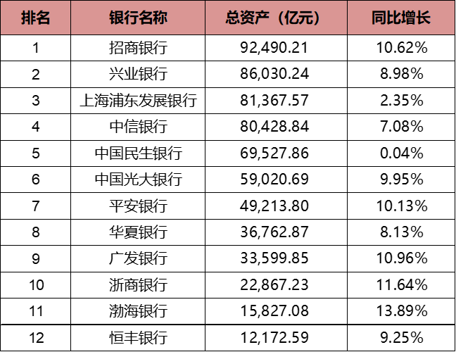 数据显示,2021年12家股份行的资产规模均较2020年有所增长。其中,招商银行突破9万亿大关,增速也超过了10%,兴业银行、浦发银行和中信银行的资产规模也均超过了8万亿元。