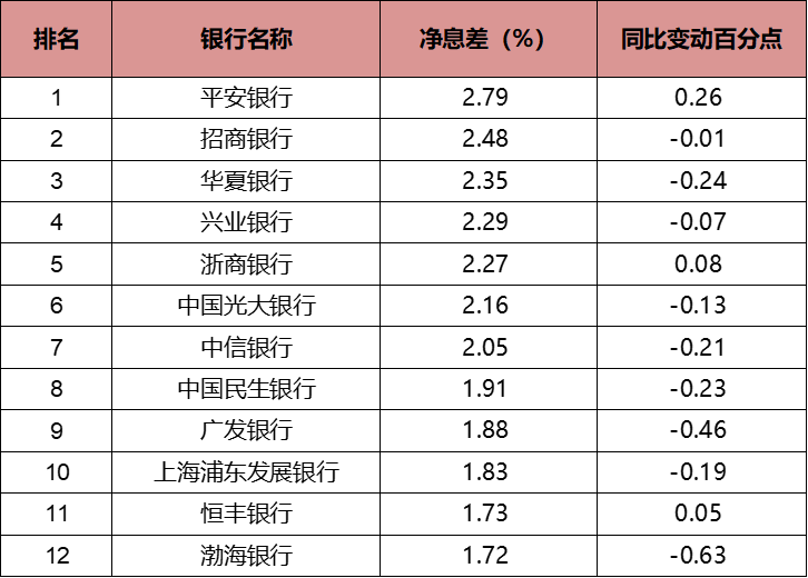 表6:2021年股份行净息差及增长情况