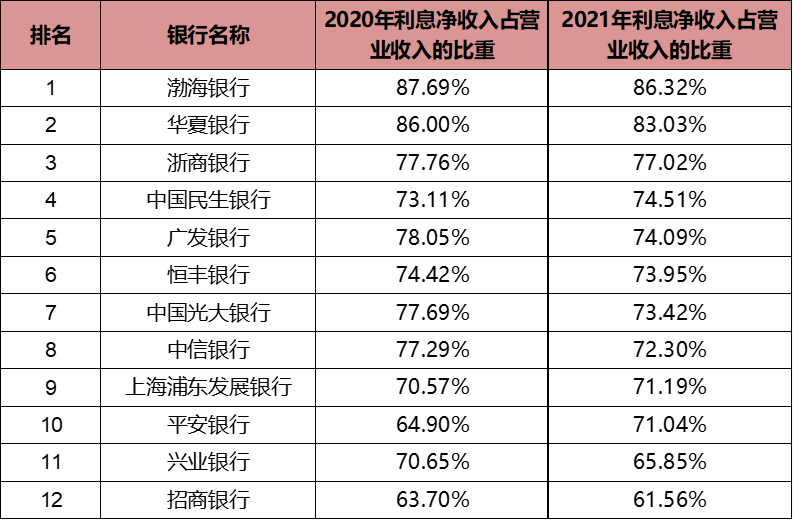 2021年,股份行的盈利模式进一步优化,对利息的依存度进一步下降,12家股份行中,9家利息净收入占营业收入的比重均相比2020年有所下降。