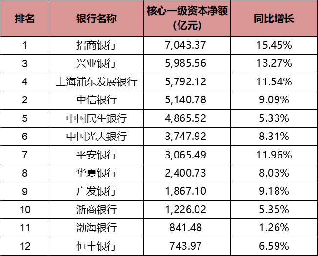 表1:2021年股份行核心一级资本净额及增长情况