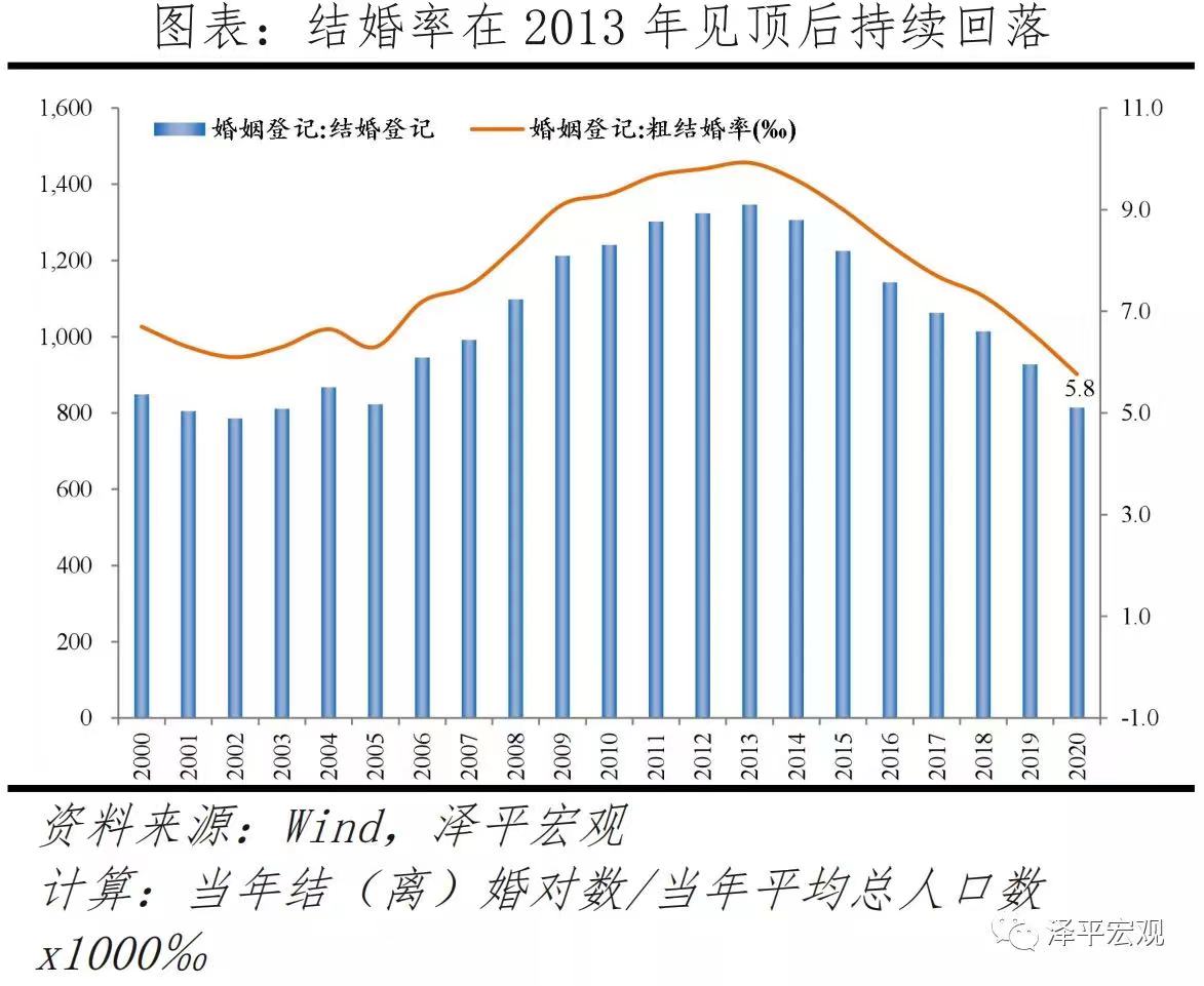 一是结婚对数和结婚率自2013年开始下滑。2013—2020年,我国结婚登记对数从1347万对的历史高点持续下滑至814.3万对,2020年同比下降12.2%;粗结婚率从9.9‰降至5.8‰。其中,《2019年民政事业发展统计公报》数据显示,2019年初结婚人数从2386万降至1398.7万人,再婚人数从307.9万升至455.9万人、复婚对数从29.9万对攀升至61.9万对。