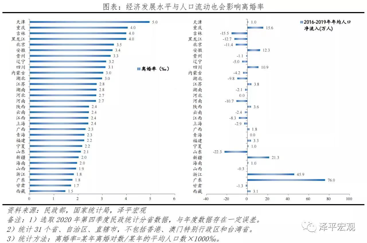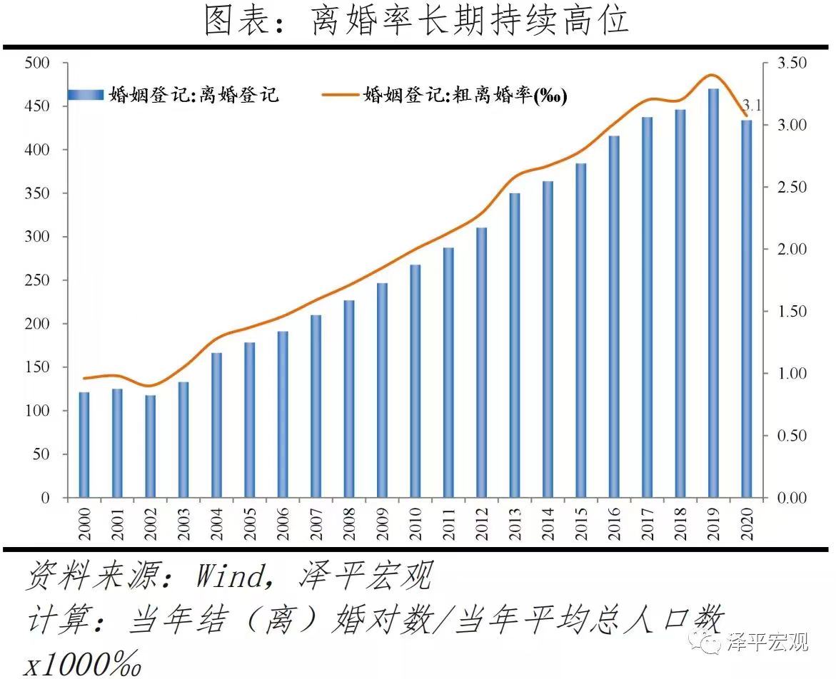 三是离婚对数和离婚率长期持续攀升。1987—2020年,我国离婚登记对数从58万对升至373万对,依法办理离婚手续433.9万对,同比-7.7%;粗离婚率从0.5‰攀升至3.1‰,较上年下滑0.3个千分点。