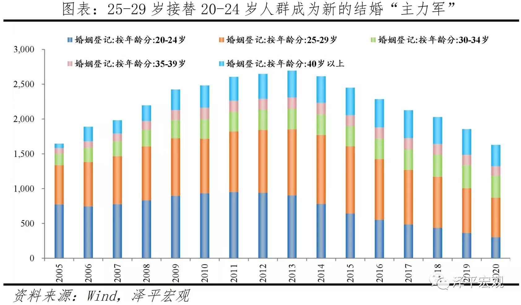 出生率下滑长期影响适婚年龄人数,进而导致结婚对数下滑。根据第七次中国人口普查资料,80后、90后、00后人口分别为2.19亿、1.88亿、1.47亿,90后比80后少约3100万,00后比90后少4100万。当前结婚年龄主力25~29岁(90后)人口大幅下滑,对结婚对数产生负面影响。